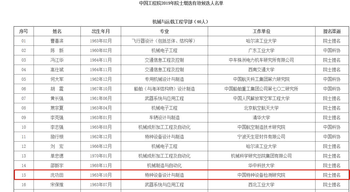 據悉:中國工程院2019年院士增選候選人提名工作于3月31日結束。經中國工程院主席團審定,最終確定的有效候選人共531位。中國機械工程學會無損檢測分會理事長沈功田先生入選增選有效候選人名單。