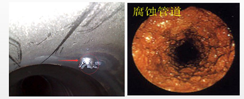 左邊圖片是對(duì)管子的檢測(cè)圖像采集,上圖很明顯的可以看到管子內(nèi)部存在著起皮。右邊圖可以看到管子內(nèi)部已經(jīng)被腐蝕。