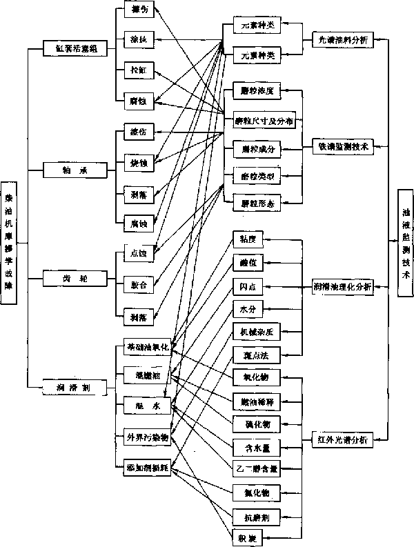 圖2.1柴油機(jī)摩擦學(xué)故障與油液監(jiān)測方法的相互關(guān)系
