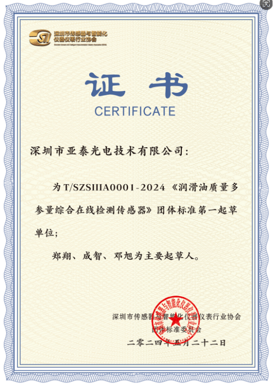 在《深圳市培育發(fā)展智能傳感器產(chǎn)業(yè)集群行動(dòng)計(jì)劃(2022-2025年)》的指導(dǎo)下,傳感器企業(yè)越來(lái)越成為深圳國(guó)民經(jīng)濟(jì)和社會(huì)發(fā)展的新質(zhì)生產(chǎn)力,但與此同時(shí),在潤(rùn)滑油在線檢測(cè)傳感器領(lǐng)域并沒(méi)有具有針對(duì)性的指導(dǎo)標(biāo)準(zhǔn)。亞泰光電牽頭起草全國(guó)首個(gè)油液監(jiān)測(cè)傳感器器團(tuán)體標(biāo)準(zhǔn)(T/SZSIIIA0001-2024),已實(shí)施并出版(由中國(guó)標(biāo)準(zhǔn)出版社出版發(fā)行,各地新華書店經(jīng)銷)。這是對(duì)深圳市亞泰光電技術(shù)有限公司和相關(guān)潤(rùn)滑油狀態(tài)監(jiān)測(cè)傳感器企業(yè)提出了更高的要求。它將推動(dòng)傳感器技術(shù)的創(chuàng)新、促進(jìn)潤(rùn)滑油行業(yè)的數(shù)字化轉(zhuǎn)型、加強(qiáng)行業(yè)間的合作與交流,并提升我國(guó)在全球潤(rùn)滑油市場(chǎng)的地位。隨著標(biāo)準(zhǔn)的深入實(shí)施和應(yīng)用,相信我國(guó)潤(rùn)滑油行業(yè)將迎來(lái)更加廣闊的發(fā)展前景。
