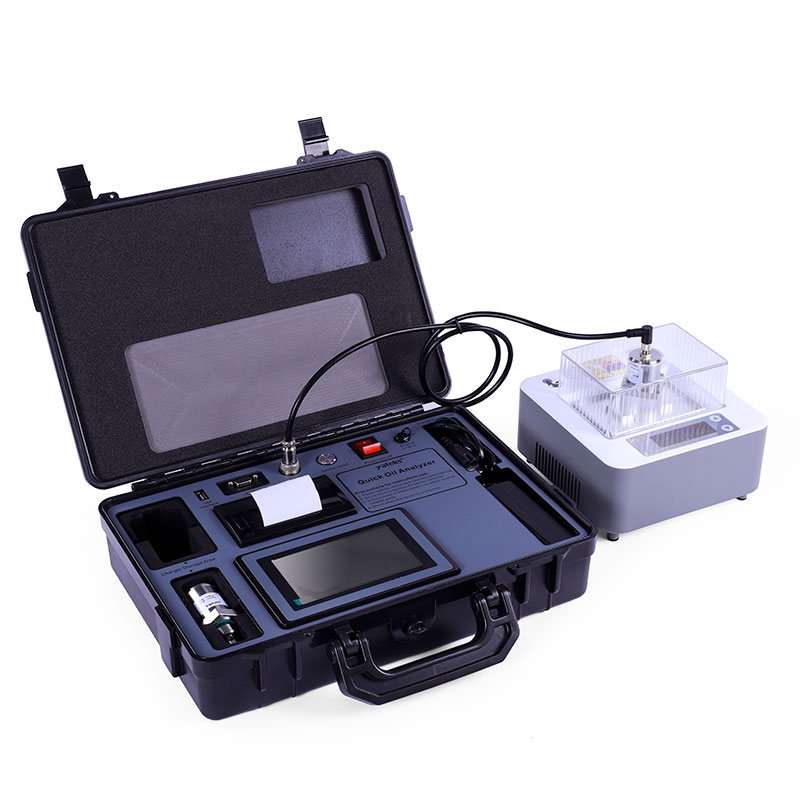 多功能快速油質分析儀主要由5英寸工業電阻顯示屏、打印機、內置電源、 恒溫裝置、流體特性傳感器等組成。通過對在用潤滑油取樣,方便、快速、 穩定的測量出潤滑油的運動粘度、密度、介電常數、溫度、含水率、含水量、 飽和度等參數。以低成本、簡單的方法實現科學的按質換油,延長潤滑油使用時間,及早發現設備故障,避免重大損失。