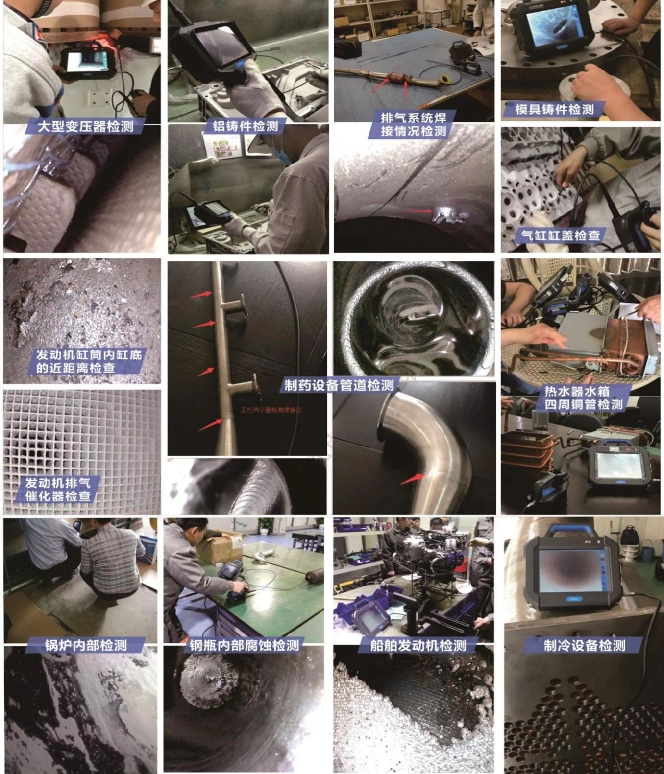 本儀器廣泛應用于航空、汽車、船舶、電氣、化學、電力等現代核心工業生產、檢修等多個環節。具有直接可視的特點,能夠直接觀測管道、渦輪、汽缸、發動機等大型裝置內表面是否存在缺陷或異狀??蛇M行實時拍照和視頻錄制,為分析設備使用狀況及設備生產保障提供不可或缺的數據采集。